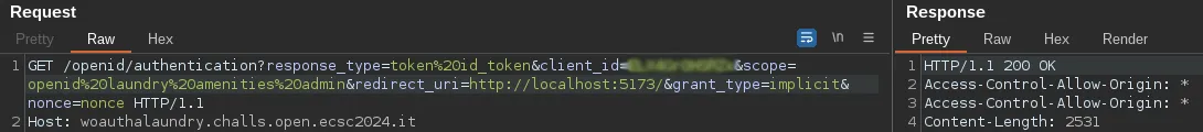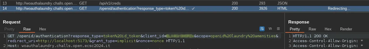 The creds request seems to be related with the OAuth framework. Inside the OpenID request, we can see several probably vulnerable parameters: redirect_uri